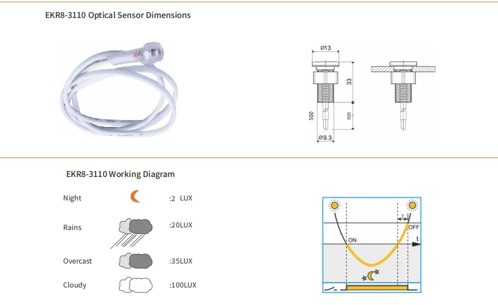 2. Когда яркость окружающего освещения уменьшается и становится ниже выбранного порога, управляющий контакт замыкается; когда яркость окружающего освещения увеличивается и становится выше выбранного порога, управляющий контакт размыкается.