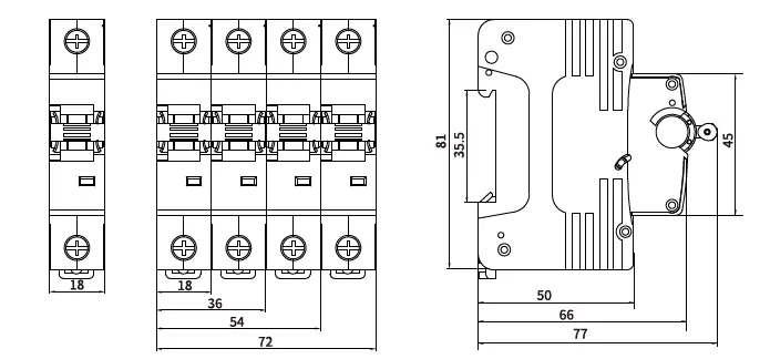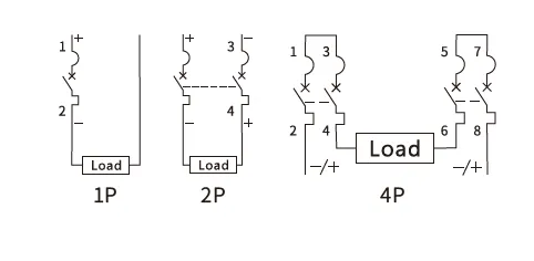 | Номинальное напряжение (Ue) | 1P(250В постоянного тока), 2P(500В постоянного тока), 4P(1000В постоянного тока) |