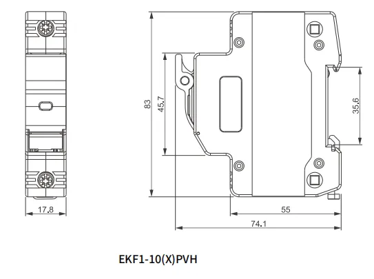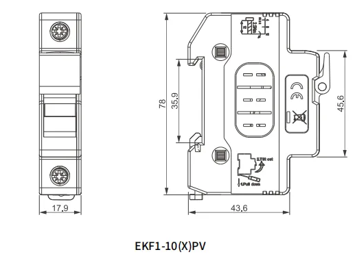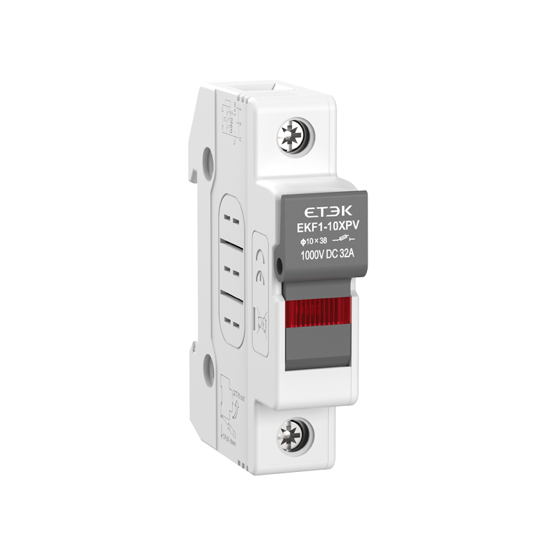 EKF1-10PV — это держатель предохранителя постоянного тока, предназначенный для защиты фотоэлектрических цепочек от коротких замыканий и перегрузок. Он имеет номинальное рабочее напряжение постоянного тока 1000 В и максимальный рабочий ток 32 А. Он надежно устанавливается с помощью стандартной DIN-рейки 35 мм для оптимальной совместимости и стабильности.