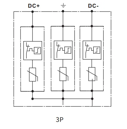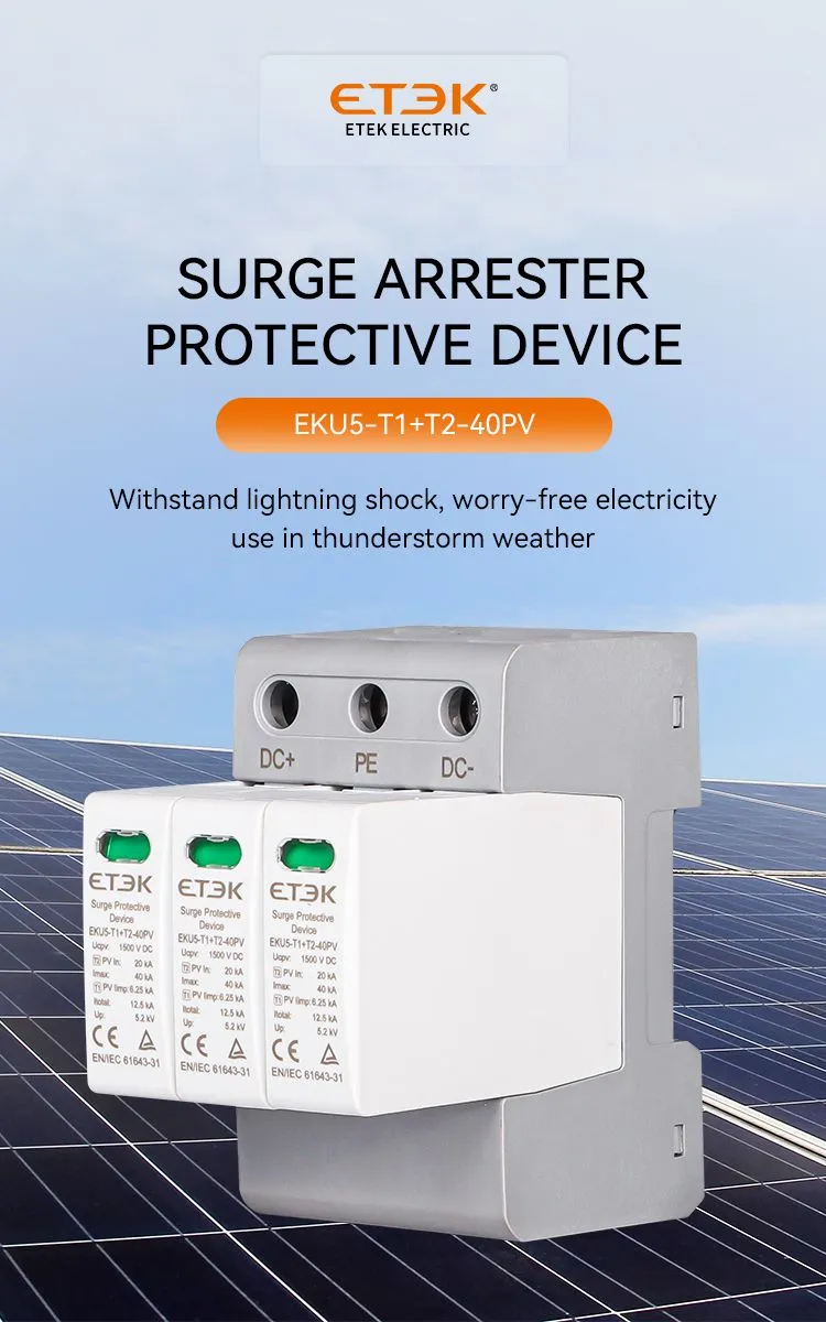 Трехмодульное фотоэлектрическое устройство защиты от перенапряжения (УЗИП) постоянного тока ETEK EKU5 класса I + II (T1+T2) (с трехступенчатым устройством переключения постоянного тока) оснащено визуальной индикацией и дополнительной дистанционной контактной сигнализацией (плавающий переключающий контакт) для использования в фотоэлектрических системах.