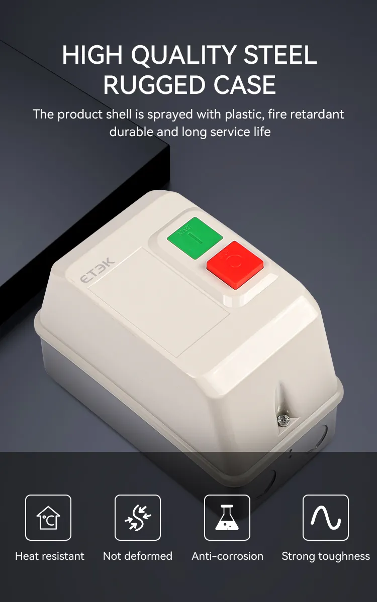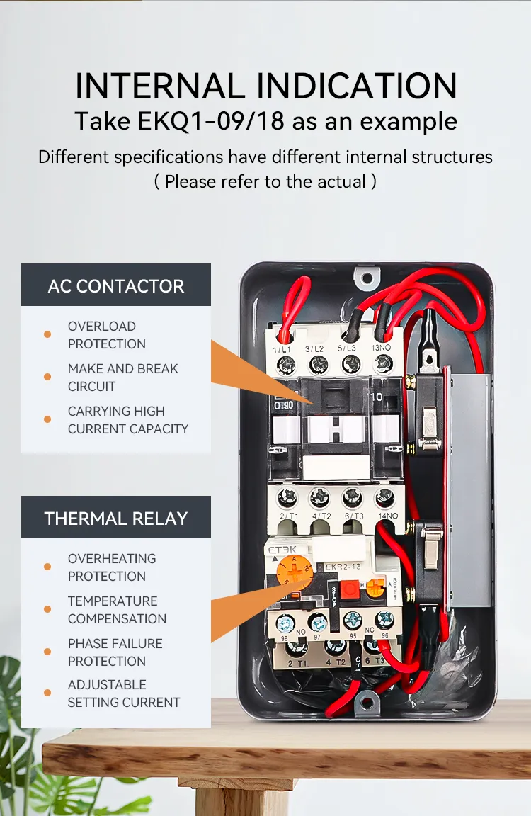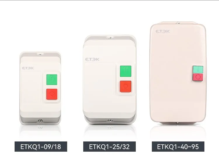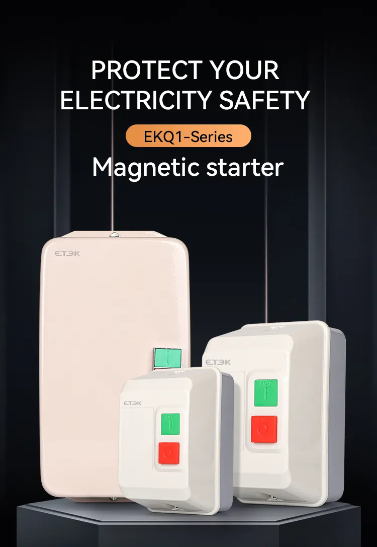 Электромагнитный пускатель серии EKQ1 (далее кратко «пускатель») используется для управления включением или выключением контактора с помощью внешнего сигнала и комбинации теплового реле и устанавливается в том же металлическом корпусе, внешний переключатель подает сигналы для управления в соответствии с подключенным контактным устройством и точками отключения, применяется в основном в цепях переменного тока частотой 50 Гц (или 60 Гц), номинальным рабочим напряжением 660 В и номинальной контролируемой мощностью до 45 кВт (ток до 95 А) для использования для управления прямым пуском и остановкой электродвигателя с целью защиты двигателя от перегрузки и обрыва фазы.