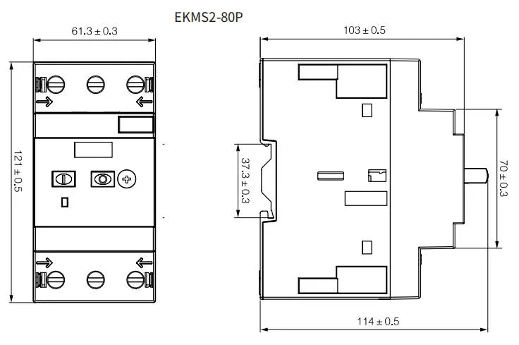 Автомат защиты двигателя (АУЗД) серии EKMS2 предназначен для цепей переменного тока напряжением до 690 В и током до 80 А. Это комплексное защитное устройство, объединяющее функции разъединителя, автоматического выключателя и теплового реле перегрузки. Его основное назначение — защита различных однофазных и трехфазных двигателей переменного тока от возможных повреждений, таких как перегрузка и короткое замыкание.