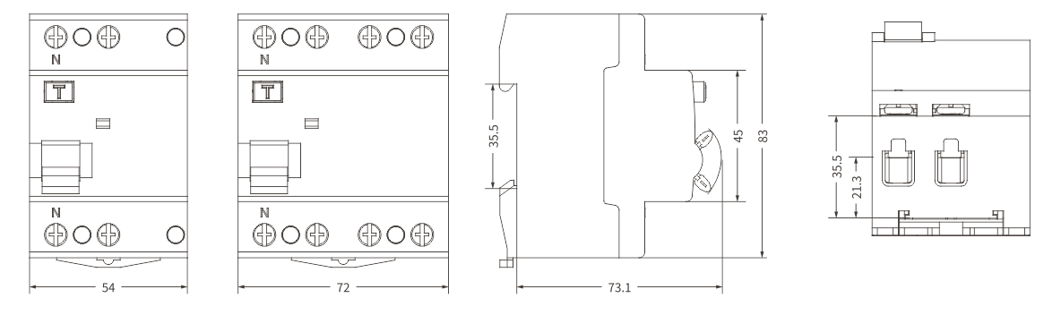 ● Полюса: 2P(1P+N), 4P(3P+N), N-полюс слева