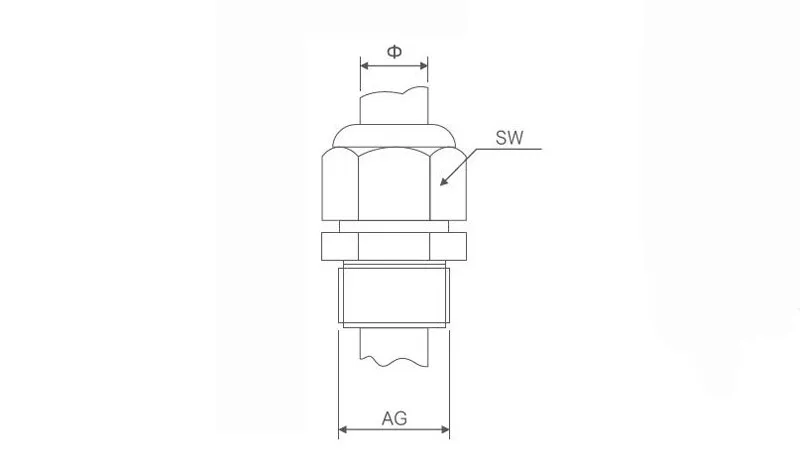 | Модель | Размер резьбы (мм) | Размер отверстия AG (мм) | Длина резьбы (мм) | Толщина стенки (мм) | Применимый кабель Ф(мм) | Размер ключа SW (мм) |